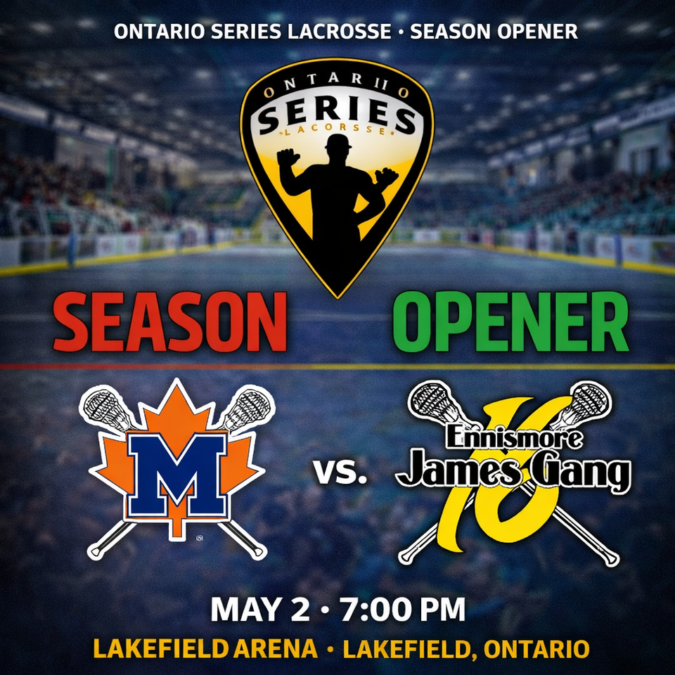 The Ontario Series Lacrosse League (OSL) opens its 2026 season on May 2nd at the Lakefield Arena in Lakefield, Ontario. The Brooklin Merchants will face the Ennismore James Gang at 7:00 PM