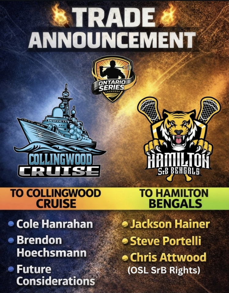 The Ontario Series Lacrosse has announced that the Collingwood Cruise and the Hamilton Sr. B Bengals have completed a multi-player trade.